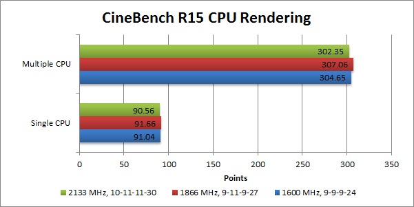 In Cinebench R15, we actually see the DDR3-1866 RAM outperforming the DDR3-2133 RAM. Once again, however, the difference is very, very small – only about 1% – so the actual real-world difference is negligible.