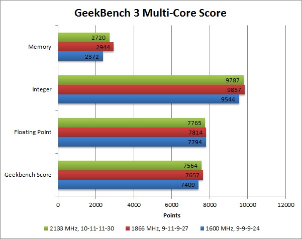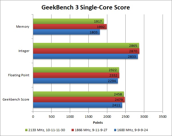 As you can see, there is a difference, but it is not very much. The DDR3-1866 RAM performed within 1% of the DDR3-2133 RAM, and the DDR3-1600 RAM was within 3%.