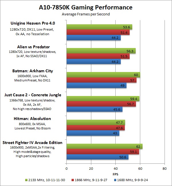 RAM speed plays a much bigger role on gaming performance when using integrated graphics, so we expect to see a much larger performance difference than we saw with the CPU-based applications.