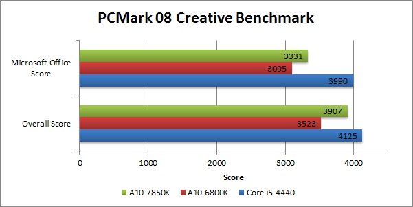 The A-series APUs from AMD have never really been able to compete with Intel CPUs on CPU-based tasks, which is pretty clearly shown in the PCMark 08 benchmark. What we didn't expect was how much better the A10-7850K performs compared to the A10-6800K. Even though the A10-7850K runs at a lower clock speed than the A10-6800K, the newer architecture allows it to be faster even at that lower clock speed.