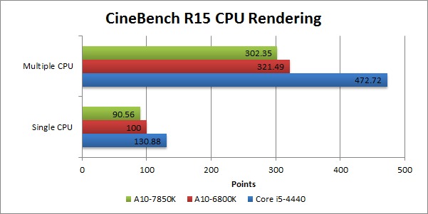 Oddly, in CineBench R15 the A10-7850K is slower than the A10-6800K. This pretty much directly counters the PCMark 08 results, although we would consider PCMark 08 to be the better measure of normal system performance.