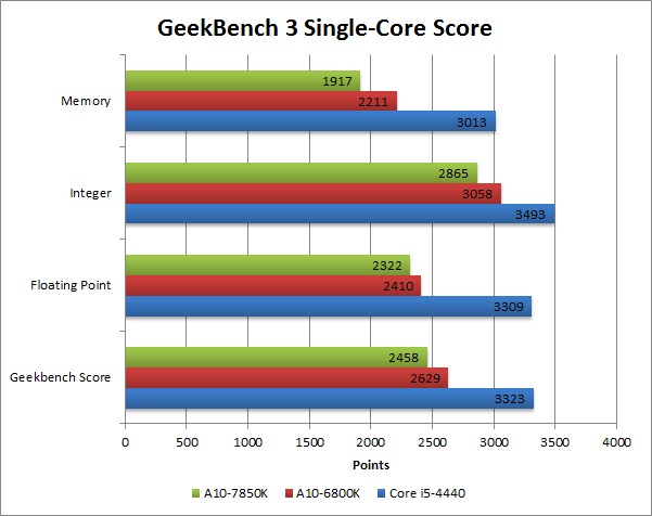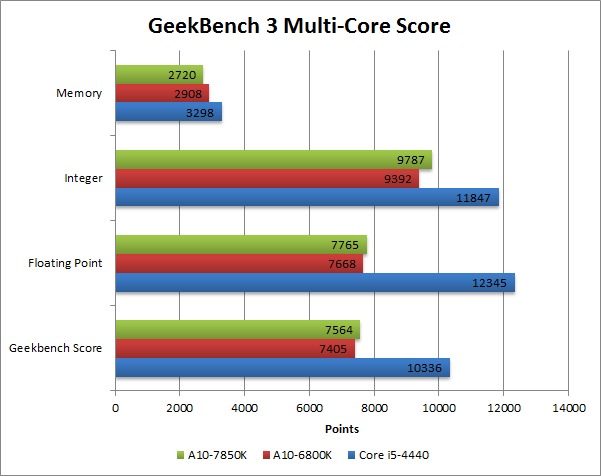 In Geekbench, the A10-6800K is actually faster than the A10-7850K in the single-core tests, but the A10-7850K is faster in the multi-core portion of the benchmark. This is interesting and indicates that the A10-7850K is not as good as the previous generation APUs when it comes to single-core applications. For anything that is multi-core capable, however, the A10-7850K should outperform the previous generation APUs.