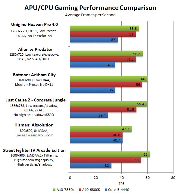 One thing that is clear across all of these benchmarks is that the Intel Core i5-4440 greatly outperforms the AMD APUs in CPU-based applications. So to show the advantage of the AMD A-Series APUs, let's next look at gaming performance using the integrated graphics.