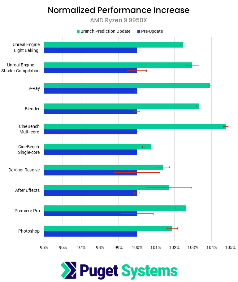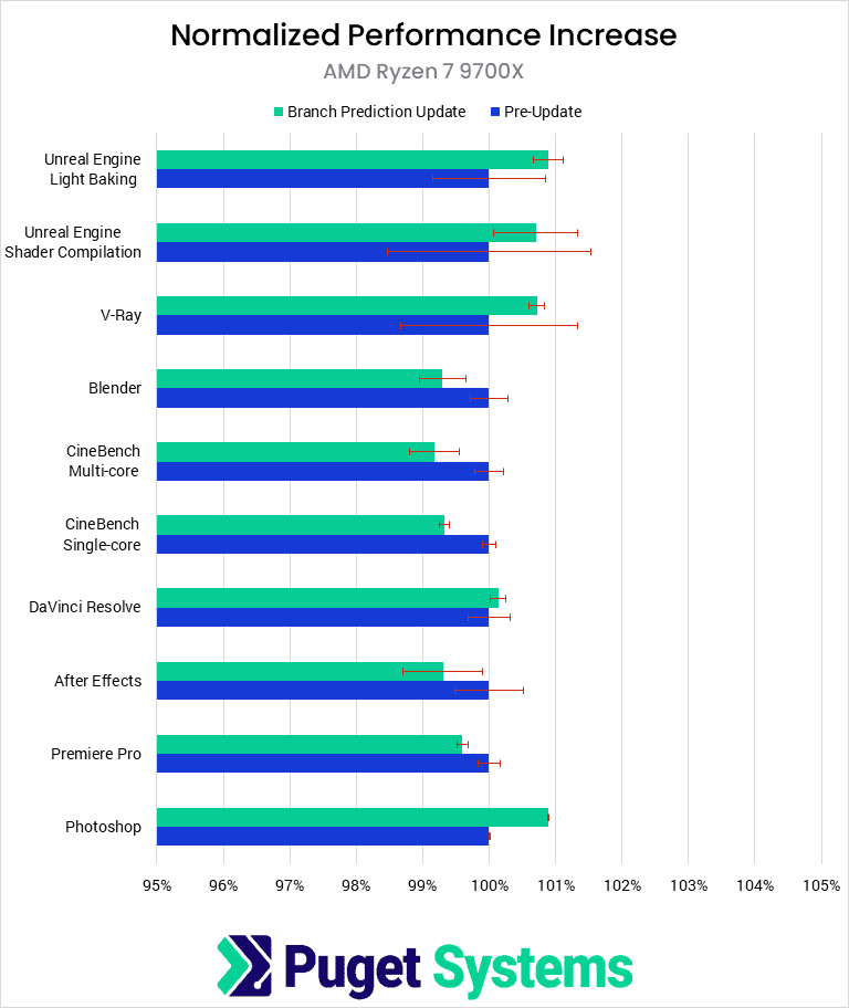 Overall, the recent Windows branch prediction update, alongside new microcode and firmware, has a relatively small effect on performance in content creation applications. Although notable for being an easy way to increase performance, the performance uplift is not large enough to meaningfully change any of our conclusions from our Ryzen 9000 review and not enough for most users to worry about for the specific workflows and applications we tested. Nonetheless, users with a Ryzen-based system should ensure that they have updated to the latest Windows release to take advantage of the free performance, and all of our reviews going forward will be done using these performance optimizations.