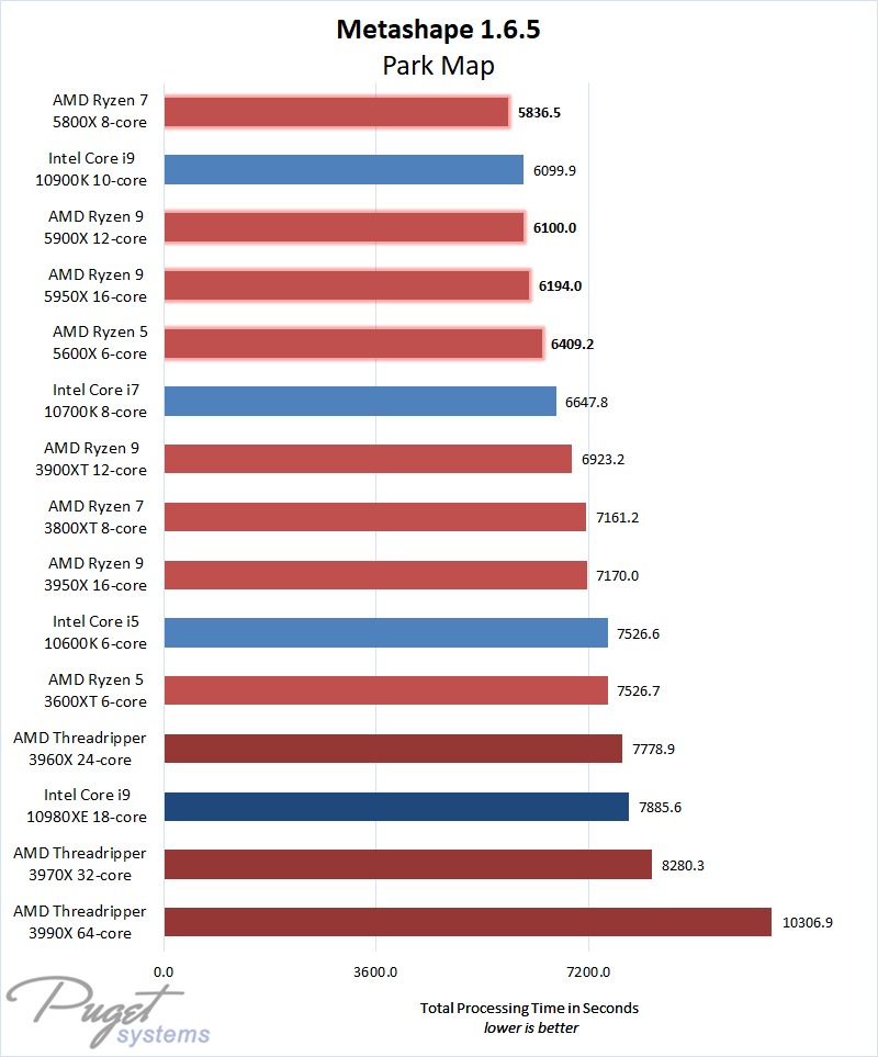 Summary: AMD's Ryzen 7 5800X is now our top-performing processor for working with maps in Metashape. The Ryzen 9 5950X and 5900X are slightly faster for dealing with complex models, rather than maps, and the only competing CPU we have tested that is in the same ballpark as these is Intel's Core i9 10900K.