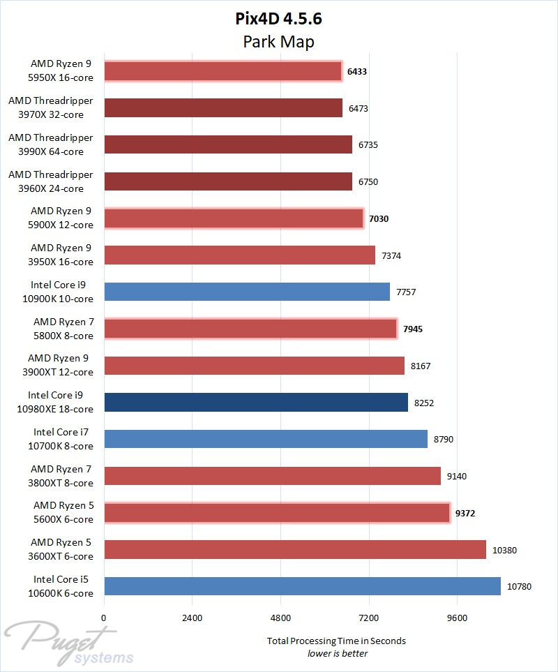 Summary: AMD's Ryzen 9 5950X is undeniably the fastest CPU for Pix4D – and the 5900X is a strong contender as well. Even the lower Ryzen 7 and 5 models offer better performance for the price than their older models or Intel's Core series equivalents. Most of these new CPUs are ~15% faster than the previous generation in Pix4D, while the Ryzen 5 5600X is "only" 10% faster than the 3600XT.