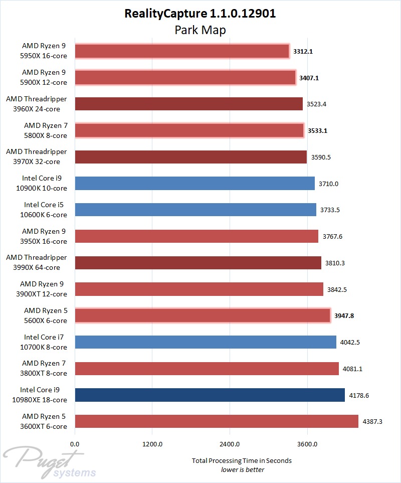 Summary: AMD's Ryzen 9 5950X is the fastest CPU we have tested yet in RealityCapture, and the 5900X and 5800X are both close behind. These processors offer fantastic per-core processing speeds, along with an ideal number of cores for this application.