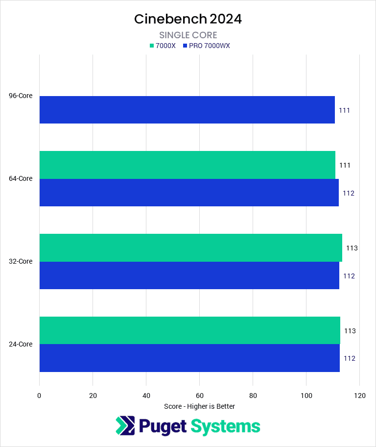 Across these three applications, the Threadripper PRO 7000WX processors are consistently faster, but by at most around 3%. Only After Effects showed more (and specifically only with the heavier projects we test for multi-frame rendering), with TR PRO performing up to 7% more at the same core count. That is overall fairly minor, and it is worth noting that none of these applications can take advantage of the 96-core 7995WX, so there isn’t even a large difference in maximum performance even if you are willing to invest in that CPU.