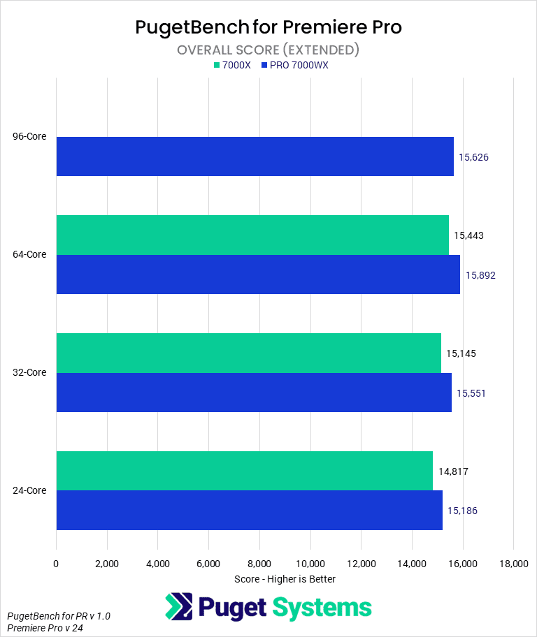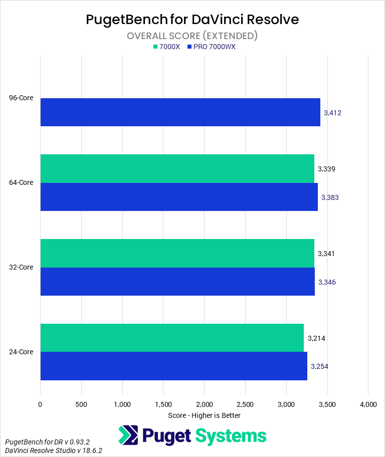 As far as platform capabilities goes, the additional memory channels don’t appear to help much (otherwise TR PRO would score higher), and 1TB of RAM on Threadripper is already excessive for this type of workflow. In most cases, 128GB of RAM is plenty, and 256GB is only necessary for the highest-end workflows. Since Threadripper 7000 can easily double, and potentially even quadruple that, the difference in memory capability is not a factor.