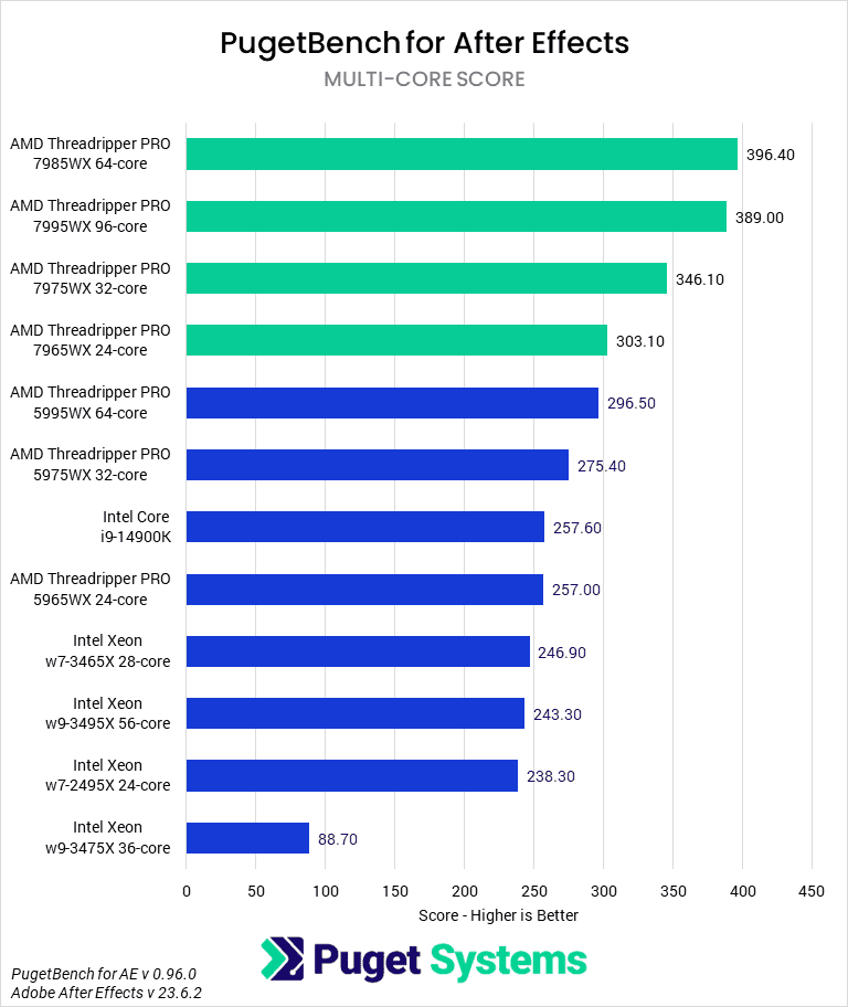 Right away, you can tell that AMD fares very well, with Threadripper PRO commanding the entire top half of the Multi-Core Score chart. Starting at the lowest core count, the Threadripper PRO 7965WX 24-core is a bit more expensive than the Intel Xeon w7-2495X 24-core, but scores an impressive 27% higher for heavy projects in After Effects. A step up from that, the 7975WX 32-core is about 40% faster than the Xeon w7-2465X 28-core (we skipped over the w9-3475X since it gives very poor results in After Effects).