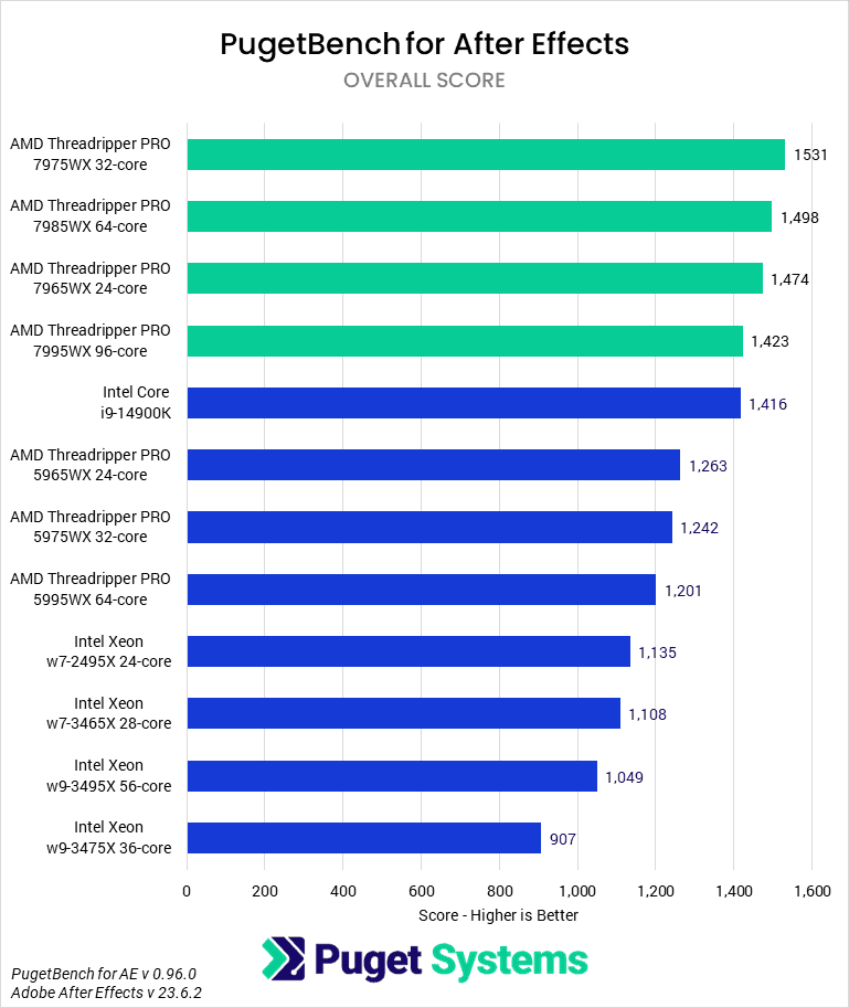 Full performance analysis: Adobe After Effects: AMD Threadripper PRO 7000 WX-Series vs Intel Xeon W-3400