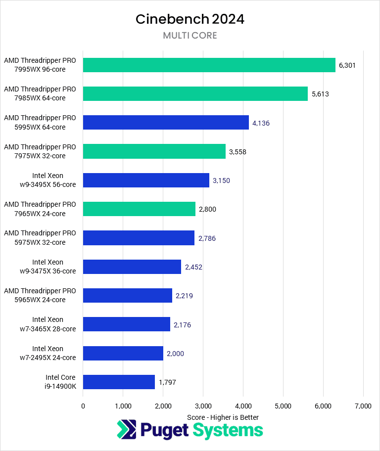 The 32-core Threadripper 7975WX is 35% faster than the Xeon w9-3475X, and once again tied the top-of-the-line 56-core w9-3495X. Moving down to the 24-core Threadripper 7965WX, it scored 32% higher than the Intel Xeon w7-2495