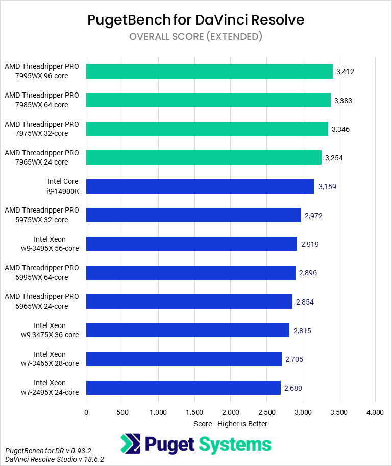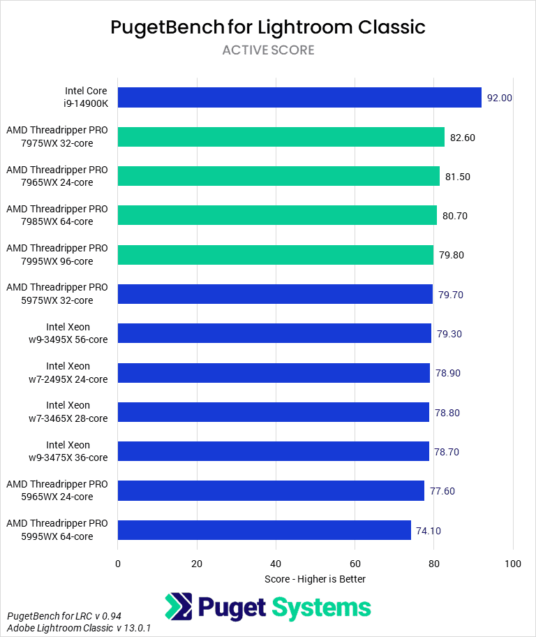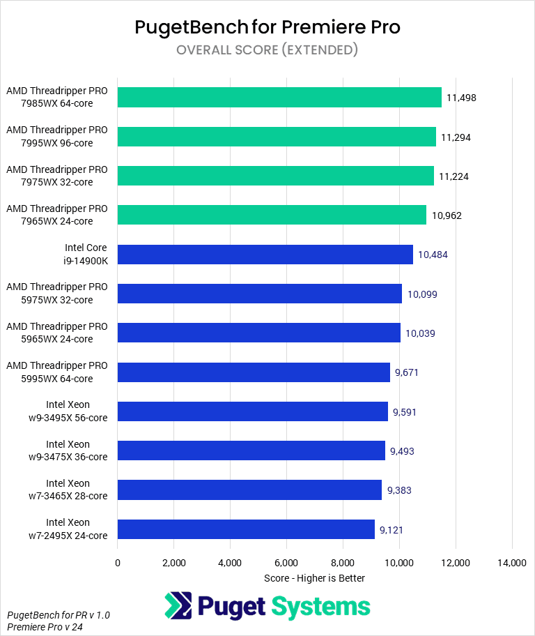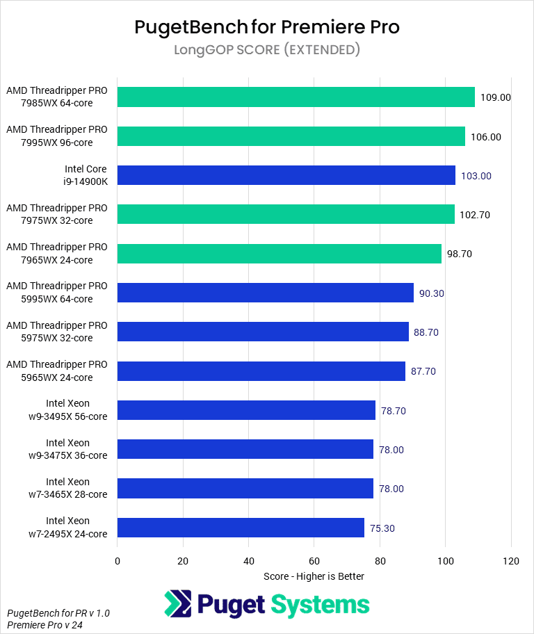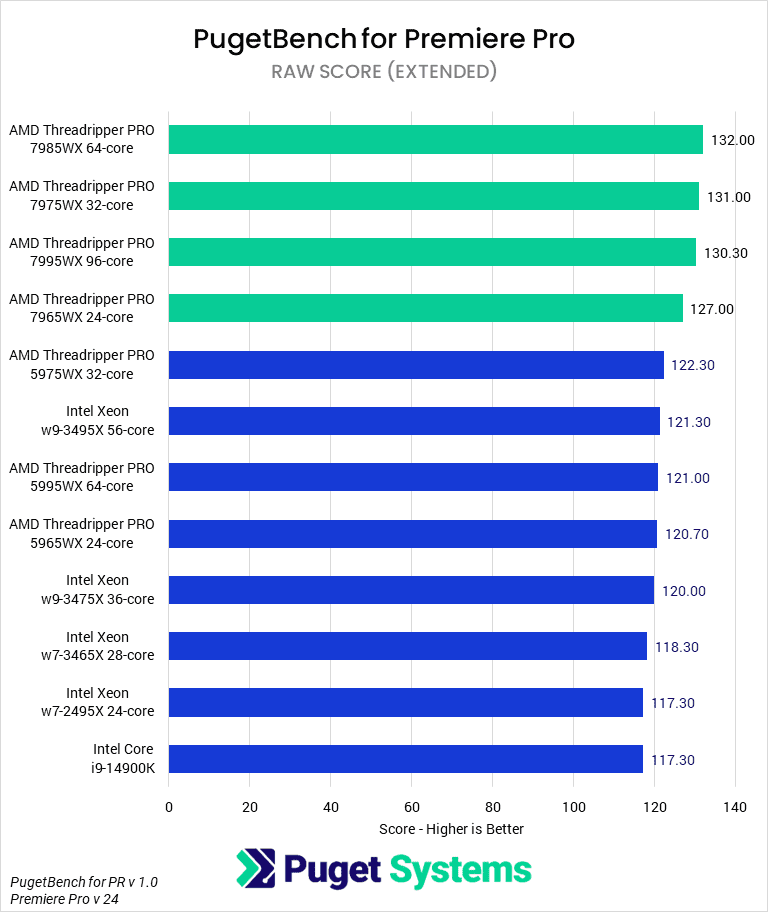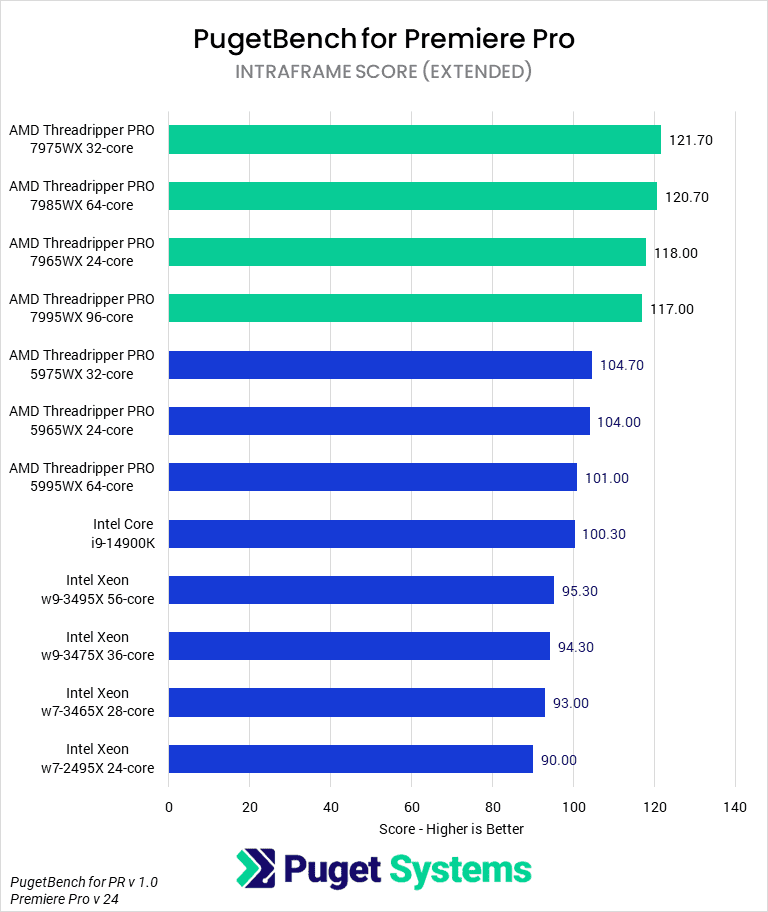 Interestingly, Premiere Pro doesn’t scale particularly well with extremely high core counts, and the Threadripper PRO 7995WX 96-core scored only a few percent higher than the 7965WX 24-core. Luckily, having more cores doesn’t seem to hurt performance like we saw in our Photoshop or Lightroom Classic testing, but in most cases, there is little reason to invest in more than the 24-core model unless you want additional headroom for multitasking.