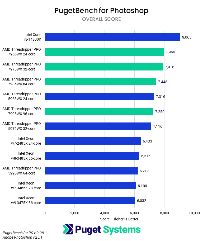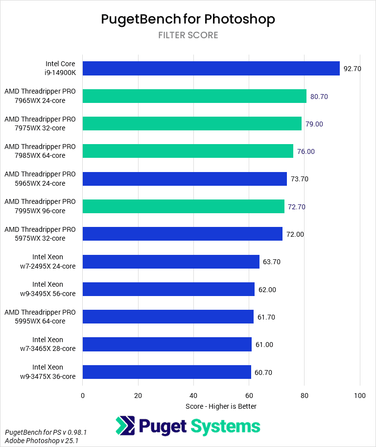 This means that CPUs like Intel Core and AMD Ryzen are simply a better fit for Photoshop alone, giving you more performance at a significantly lower cost. Still, given how many workflows utilize Photoshop to some degree, there are many use cases where a user may opt to take a performance hit in Photoshop in order to get better performance in other aspects of their workflow. For example, this is very common in the VFX industry, where rendering or simulation benefits from high CPU core counts, and the work being done in Photoshop is relatively light, so a 10-15% performance hit is acceptable.