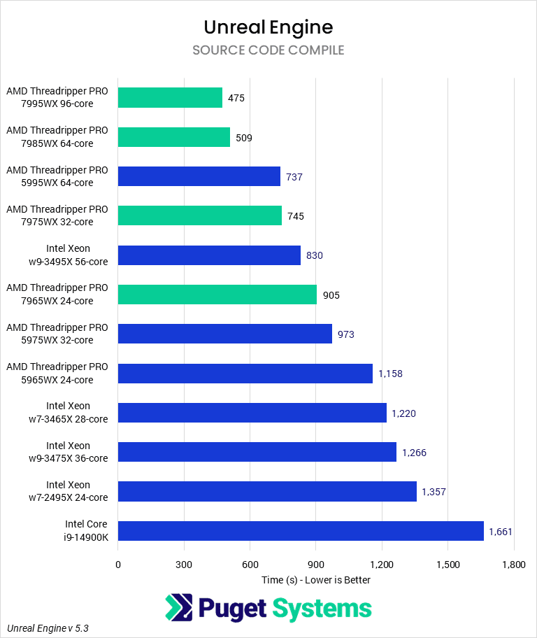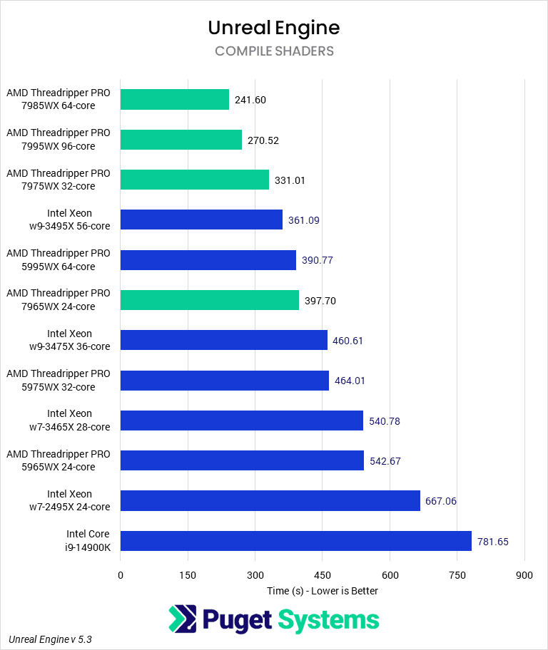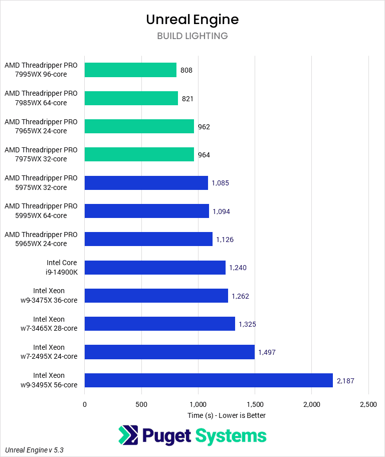 Unreal Engine has a very wide variety of users in different industries, and most of the heavy lifting in Unreal Engine is GPU-bound. Regarding CPU-specific tasks, we look at shader compilation (which everyone experiences from time to time at the very least), light baking, and code compilation in Visual Studio. Light baking is quickly falling out of favor with the adoption of Lumen and GPU Lightmass, but some users may still prefer it. Unreal Engine also has some workflows that can take advantage of the extra memory channels offered by the WRX90 chipset that are not available on the non-pro CPUs.