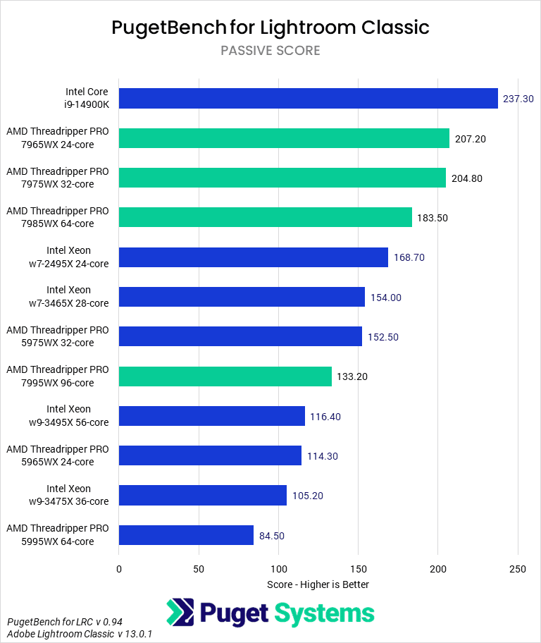 Unlike applications like Photoshop, which are fairly linear in the way they use hardware, Lightroom Classic behaves very differently depending on the type of task you are looking at. Our benchmark breaks down the tests into two groups: active and passive. Active tests (chart #2) look at things like switching modules and scrolling through images that individually take a short amount of time but are done hundreds or thousands of times a day. These tasks are typically lightly threaded, and performance is largely based on the per-core performance of your CPU. On the other hand, passive tasks (chart #3) like importing, exporting, and generating previews are moderately threaded and – up to a certain point – can utilize CPUs with more cores. However, in most cases, even what is available from an Intel Core or AMD Ryzen CPU is enough to “saturate” Lightroom Classic, so once again, Threadripper PRO and Xeon tend to underperform compared to more affordable CPU families.
