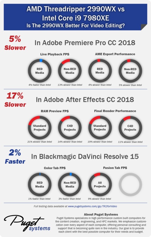 In both Premiere Pro and DaVinci Resolve, most users are unlikely to notice a difference between the AMD Threadripper 2990WX and the Intel Core i9 7980XE. However, for motion graphics work in After Effects the i9 7980XE is significantly faster. Due to this, we would in general recommend going with the Core i9 7980XE over the Threadripper 2990WX.
