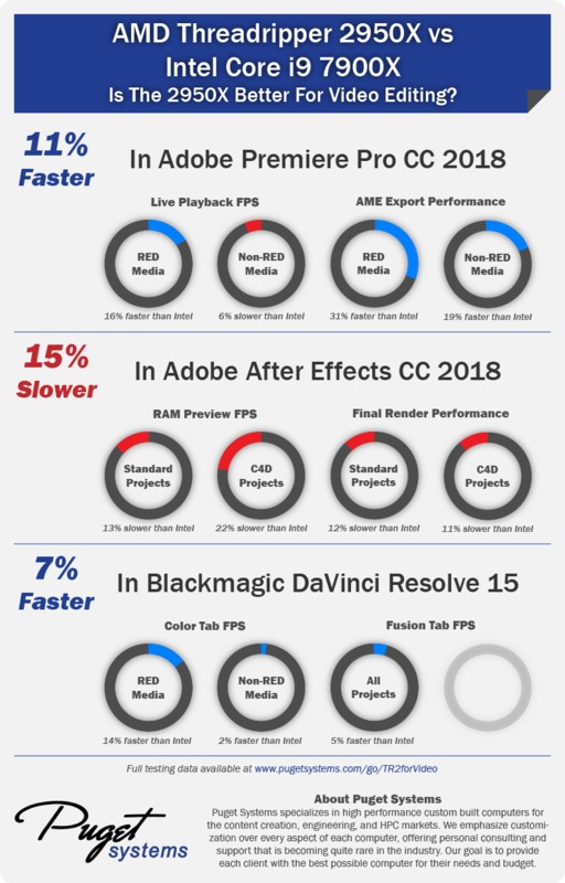 Unlike the 2990WX, the Threadripper 2950X is a great choice for many video editors. It lags behind the similarly priced Core i9 7900X for motion graphics work in After Effects, but is overall faster in both Premiere Pro and DaVinci Resolve. Especially if you work with RED media, the 2950X is a great choice for a video editing workstation.