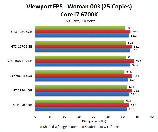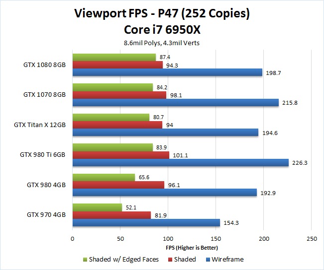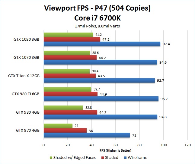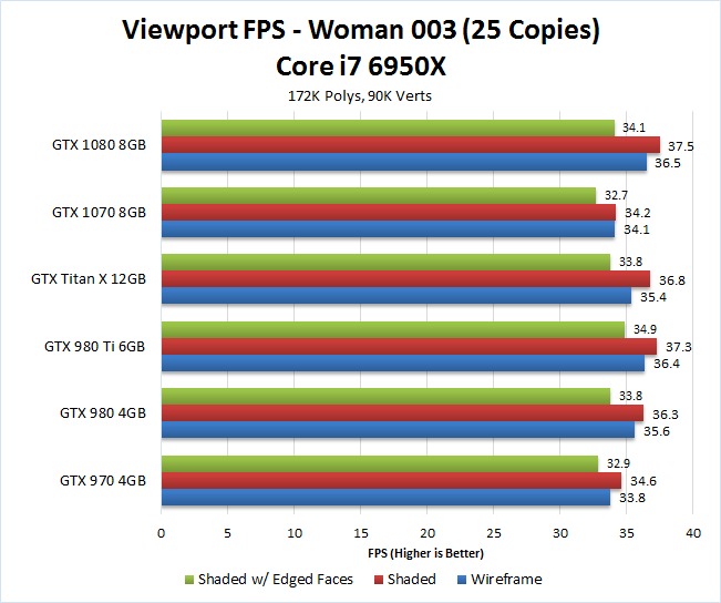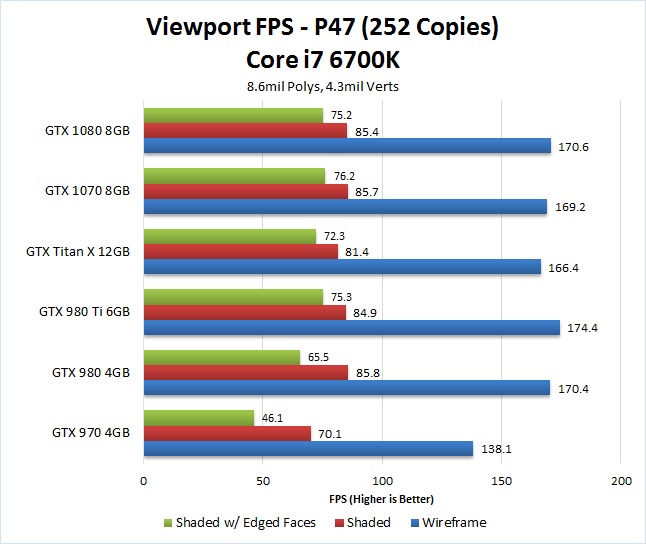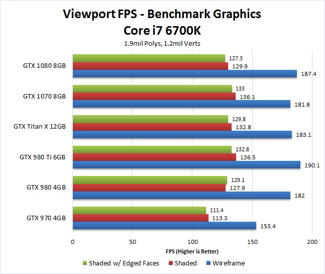 Using Shaded with Edged Faces, the GTX 980 was about 36% faster than a GTX 970 on the Core i7 6700K system and about 20% faster on the Core i7 6950X system. For the higher end cards, they were all about 20% faster than the GTX 980 on the Core i7 6700K system and about 30-40% faster on the Core i7 6950X system. Out of these cards, the GTX 1080 was a hair faster than the others, but only by a few percentage points.