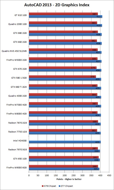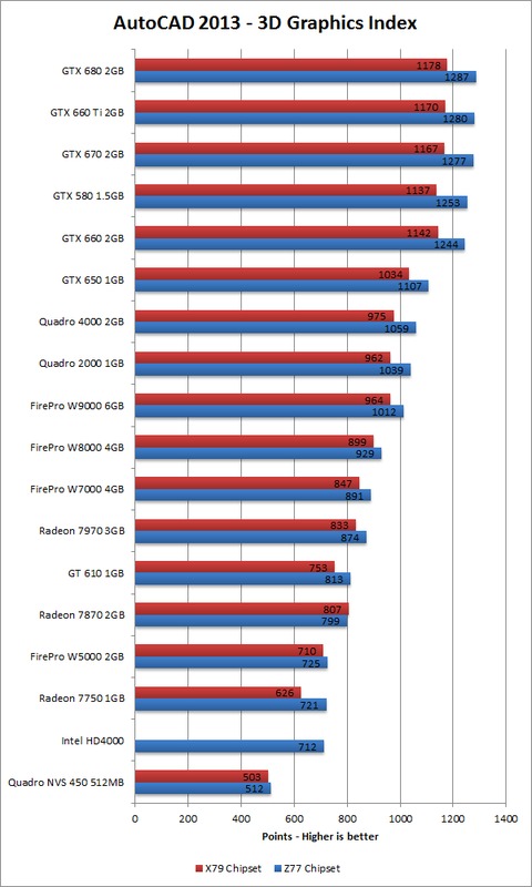 Before we examine the overall results, there are two things to point out. The first is something we did not even intend to benchmark, which is that the Z77 system consistently scored higher than the X79 system. Considering that we were using the fastest CPU currently available for each platform and identical RAM, we can conclude that the Z77 platform (using Ivy Bridge CPUs) performs better than the X79 platform (using Sandy Bridge-E CPUs) in AutoCAD 2013. Second, 2D graphics does not appear to be affected by the video card at all. While there is some variance in the results, they are all minor enough to simply be normal testing fluctuations.