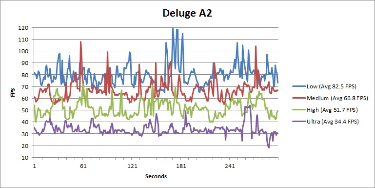 From these results, we see that the Deluge A2 should have no problems running Battlefield 3 on High settings. Ultra settings may even be acceptable for some, but the low 18 FPS minimum means that you will have noticeable lag during high-action scenes.