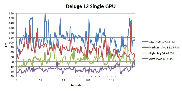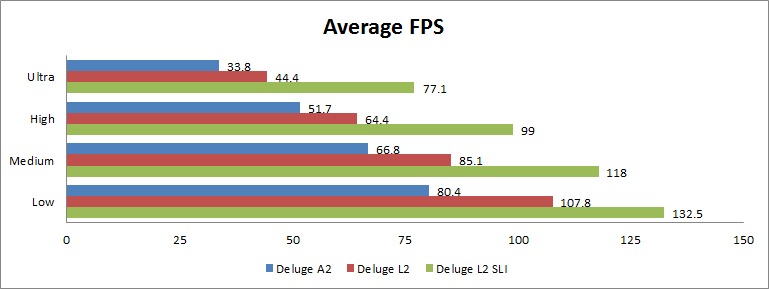 The results for the Deluge A2 do not bring up any variances from the overall results. The FPS on Ultra settings is lower than what most users would want to run, so we can certify this configuration for High graphics settings only.
