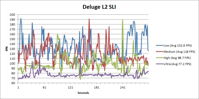 The Deluge L2 with a single GTX 580 is right on the edge of running the game on Ultra settings. 34 FPS is little below the minimum we would like to see, but for some users may be acceptable. The SLI configuration however will have absolutely no problems on Ultra graphics, with an impressive 67 FPS minimum and 77 FPS average.