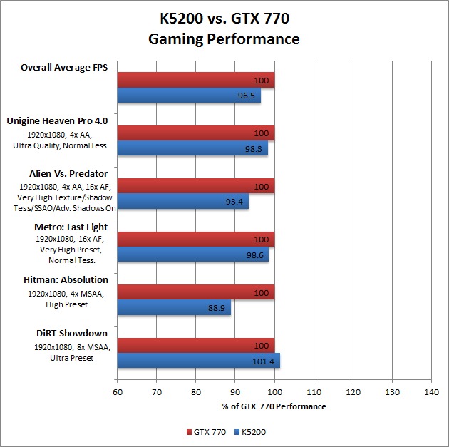 On average, this makes the Quadro K5200 only 3.5% slower than the GTX 770 versus the 5% we expected based on specifications alone.