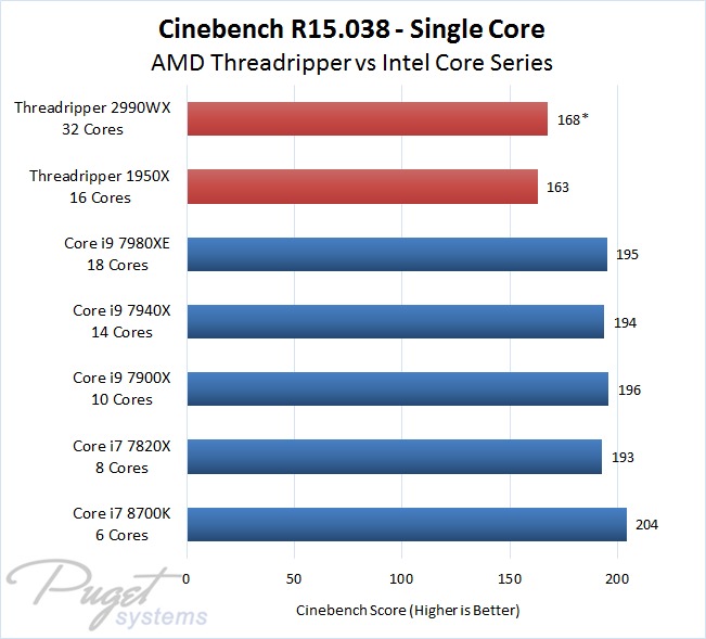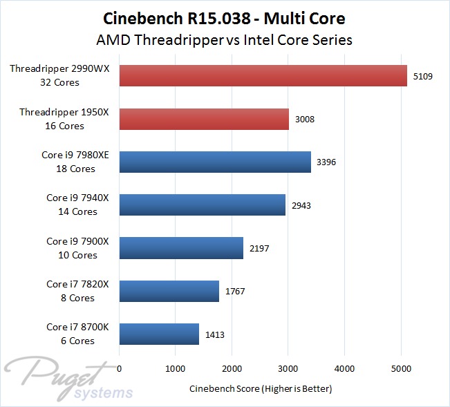 To put the new Threadripper 2990WX's performance in Cinema 4D into perspective, we are also taking a look at the flagship of the first generation: the 16-core 1950X. In addition we have results from several of Intel's Core series processors, ranging from 6 to 18 cores, to compare them to on the latest release of Cinebench. The i7 7820X and i9 7900X results were pulled from previous Cinema 4D articles.