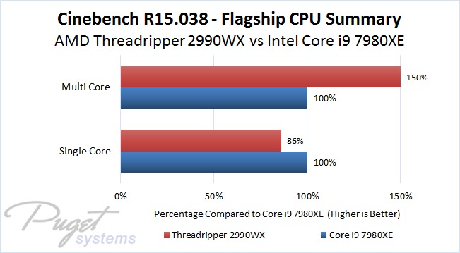 The first graph above, showing multi-core rendering performance, highlights Threadripper 2's strength. In applications like this, where every core can be put to use at the same time, the 2990WX and its 32 cores absolutely trounce every other single-CPU configuration currently available. It is about 70% faster than the older 1950X, and 50% faster than Intel's Core i9 7980XE… even though the 2990WX is 10% less expensive ($1799 vs $1999). For pure CPU-based rendering, AMD's Threadripper 2 is nothing short of fantastic.