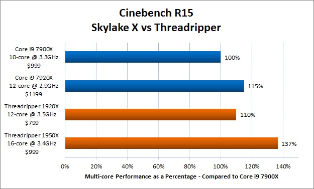 Here is a summary of Cinebench multi-core performance between just the top two Skylake X and Threadripper processors: