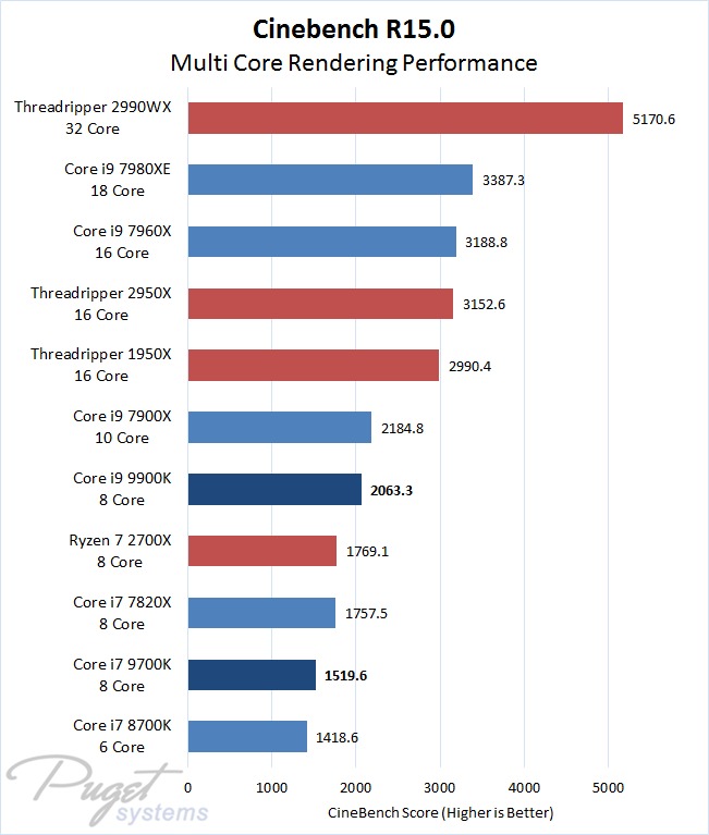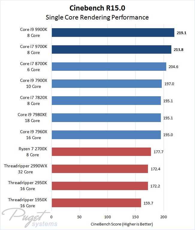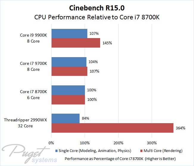 The first graph above, showing multi-core rendering performance, gives a good overview of how the new Core i7 and i9 processor stack up for heavily threaded applications. The i7 9700K outpaces the older i7 8700K thanks to two additional cores and a little higher clock speed, even though it does not have Hyperthreading. The i9 9900K scores almost 50% higher, though, since it has the additional cores and clock speed while maintaining Hyperthreading as well. None of those CPUs compete for the top multi-core performance slot, though. For multi-threaded, CPU-based rendering AMD's Threadripper 2990WX is still the way to go.