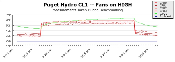 These graphs represent the idle and load CPU temperatures over the course of testing. It’s easy to see the winners and losers here — the Nexus ran much hotter than the others while the Puget Hydro CL1 was the best. The comparison between the Intel Stock heatsink and the Gelid Silent Spirit is interesting. Though the Gelid only cooled a few degrees better, it was significantly quieter. While the Puget Hydro CL1 is the clear pick for cooling performance, the Gelid Silent Spirit could also be a good choice in lower power situations when noise level is a concern.