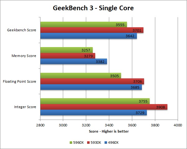 One thing we want to point out is the low memory score on both the 5960X and 5930K. These CPUs use the new DDR4 memory running at 2133MHz versus the DDR3 memory running at 1600MHz we used with the 4960X. One benchmark is obviously not conclusive, but this does suggest that DDR4 memory might not have much of a performance advantage over DDR3 quite yet.