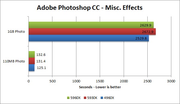 The 110MB image shows roughly a 5% drop in performance with the Haswell-E CPUs compared to the 4960X. The 1GB image also shows a drop in performance, but the 5960X is a bit better than the 5930K. What this means is that if you use Photoshop a lot and already have a 4960X CPU, you probably should not upgrade to a Haswell-E CPU.