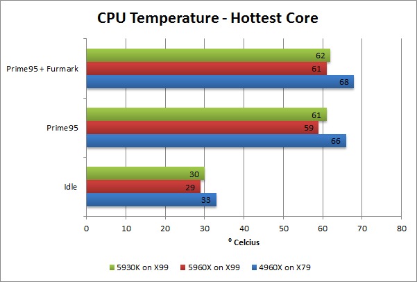Haswell-E CPUs have a TDP of 140W so we expected them to run hotter than Ivy Bridge-E which has a TDP of only 130W. Interestingly, however, both the 5960X and 5930K ran cooler than the 4960X both at idle, high CPU load, and high CPU+GPU load.