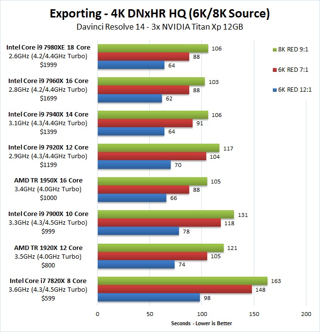 Today, we have published our first two articles for DaVinci Resolve. This article will be looking at how performance changes with different models of CPUs while out other article will be looking at GPU scaling performance with 1-4 NVIDIA Titan Xp video cards. There is quite a bit more we want to test, but this is an excellent start and will allow DaVinci Resolve users to give us feedback on our test process that we can leverage in future articles. Plus, we wanted to get these articles up before we left for the NAB Show in New York next week (Oct 17-18, 2017). Come visit us at booth N570 in the "Post + Production Pavilion" of Hall 3B if you happen to be attending!