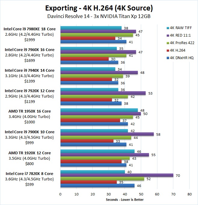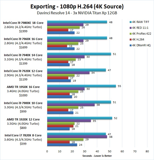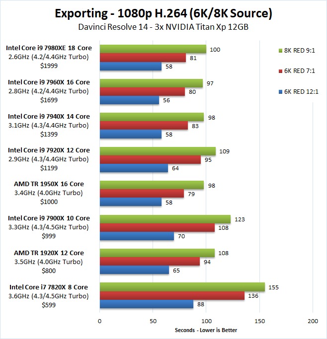 With the Intel Core i9 CPUs, the performance gains start to plateau the higher you get, but we saw some decent performance gains all the way up to the Core i9 7960X 16 core. Interestingly, the Core i9 7980XE 18 core was actually slower than the Core i9 7960X in almost every case so while there is an argument for having a high number of CPU cores, there is definitely an upper ceiling when exporting.