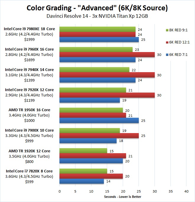 One point we want to make sure to call out is that we didn't see any benefit to using the Core i9 7980XE 18 core. In almost every case, the Core i9 7960X 16 core was actually faster. There may be an argument for the 7980XE from a multi-tasking standpoint, but even then having two more cores likely isn't worth the 4% drop in FPS when color grading.