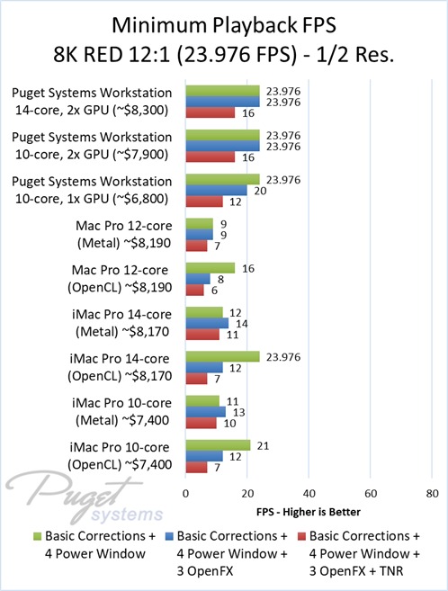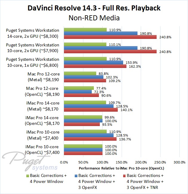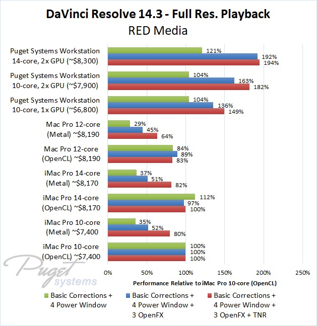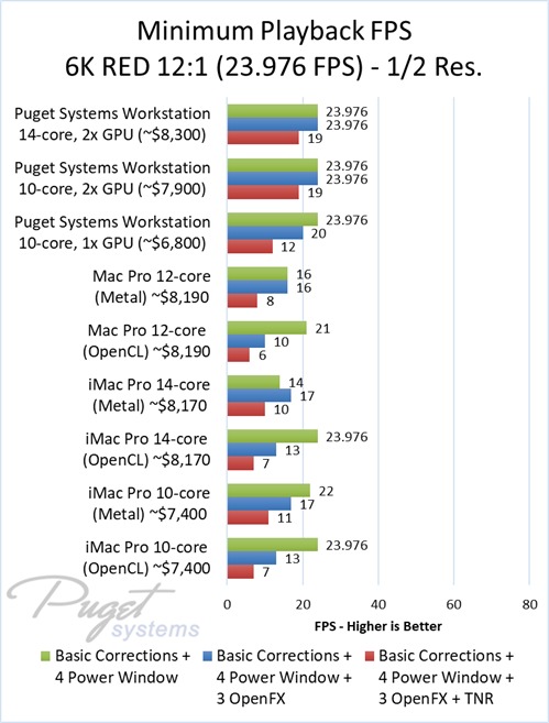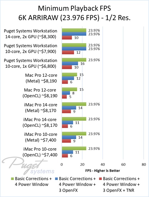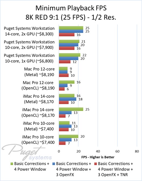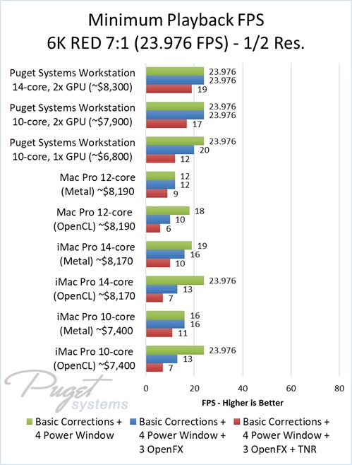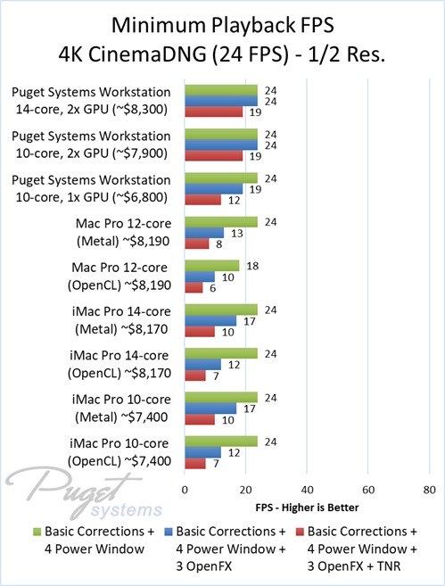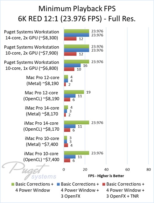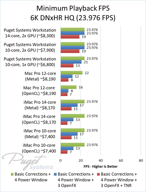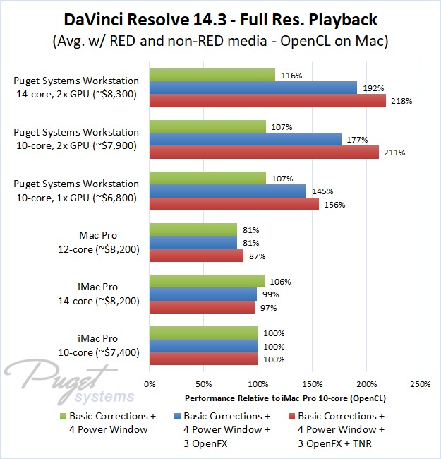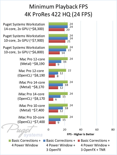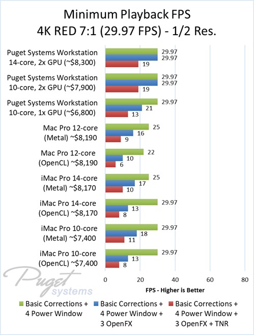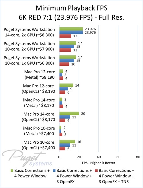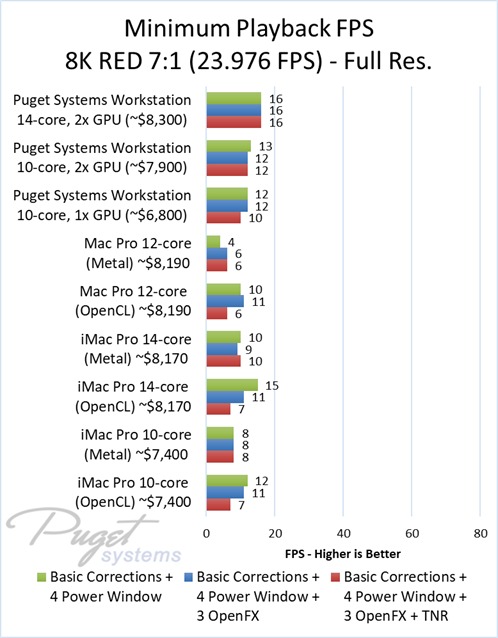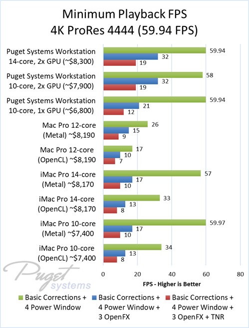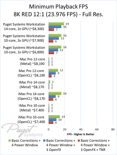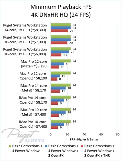 As an example, our $6,800 PC workstation should give you anywhere from a 45 to 55% increase in FPS if you use OpenFX or other heavy effects like TNR. Moving up to a PC that is roughly the same cost as the high-end Mac Pro and iMac Pro systems we tested, you are looking at up to twice the FPS.