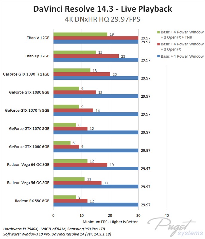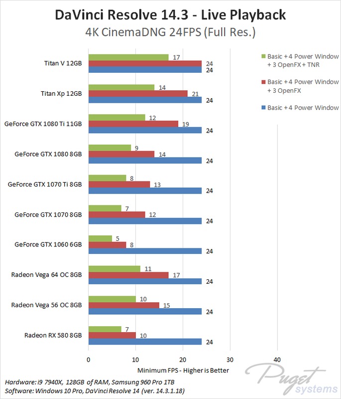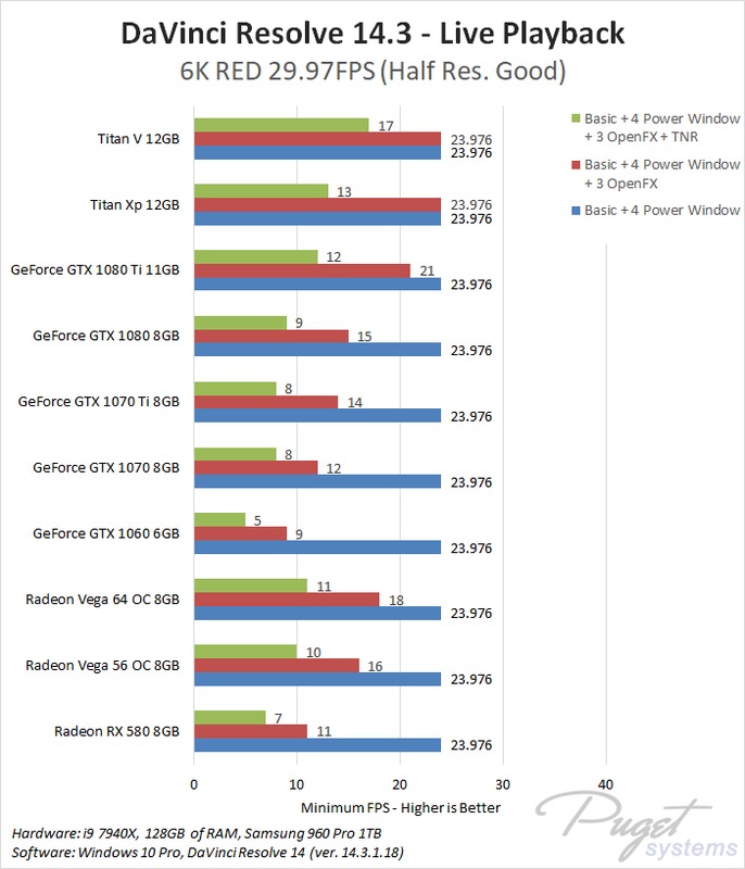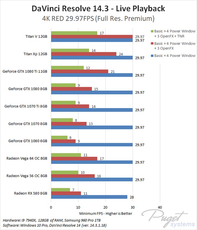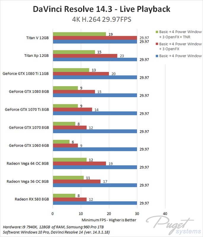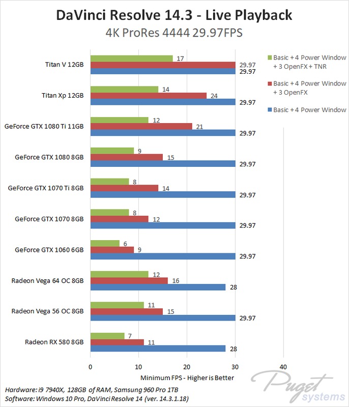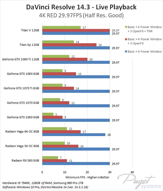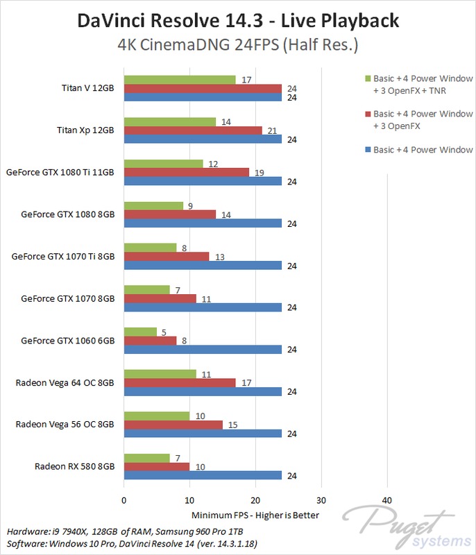 This CPU, RAM, and storage combination we are using is among the best you can currently get for DaVinci Resolve which should give each GPU the chance to perform to the best of its ability. To compare AMD and NVIDIA, we chose a wide range of cards from both the Radeon and GeForce lines. We also decided to include the NVIDIA Titan cards even though they are well beyond the pricing of the AMD cards because we actually sell a decent number of Resolve workstations with Titan cards so this is simply to help show the top-end performance you can get out of a single GPU.