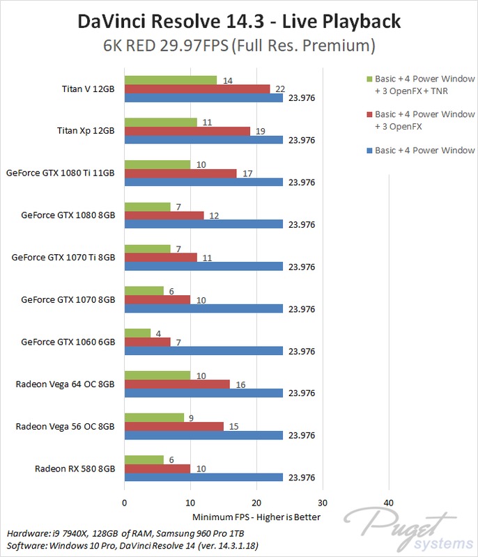 With that said, we saw almost no difference between any of the cards with our relatively light testing with just a basic grade and four Power Windows. Really the only reason each card did not score a perfect 100 was due to the 8K RED Full Resolution test where most cards achieved ~20 FPS rather than 25 FPS.