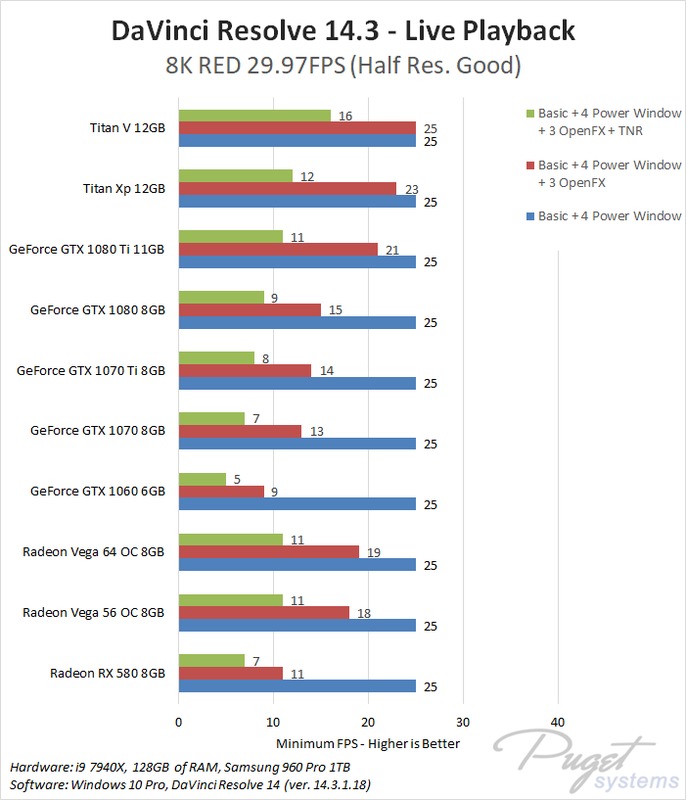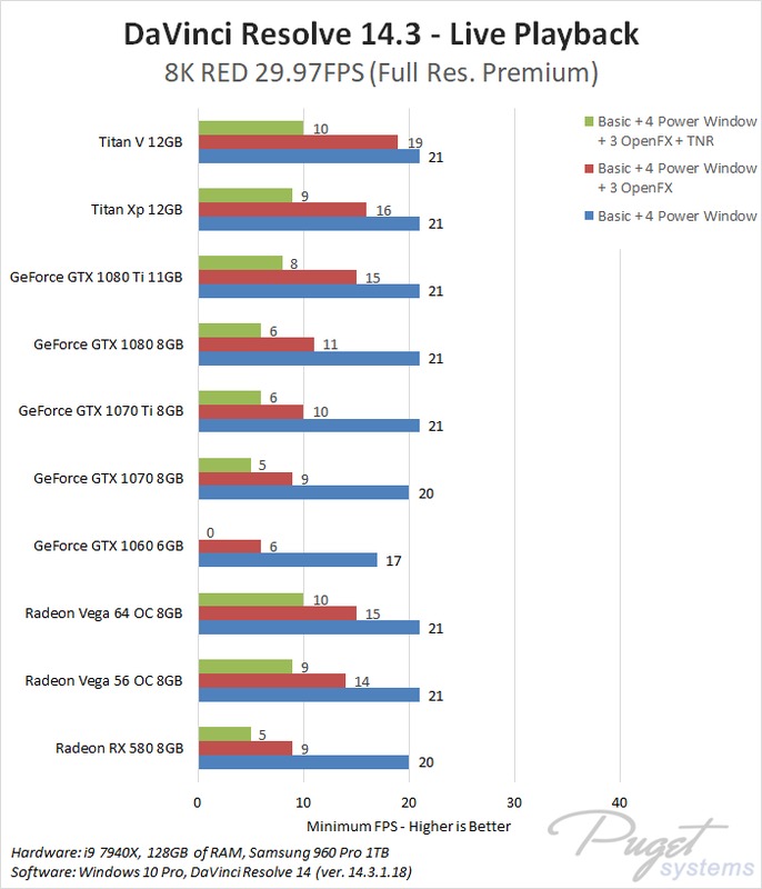 One thing we do want to point out is that the GTX 1060 6GB card consistently caused Resolve to crash when we tried to do this test on 8K RED media. For this test, the 6GB of VRAM is simply not enough to keep up. On the other hand, if you are working with 8K RED footage and applying Temporal Noise Reduction nodes… you really should invest in a much faster card with more VRAM!