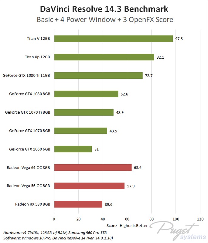 Something we do need to point out, however, is that even the Radeon Vega 64 is really more of a mid-range card for DaVinci Resolve. If you are looking for the best performance, the slightly more expensive GTX 1080 Ti will be about 6% faster on average than the Radeon Vega 64. And if you have a larger budget, the Titan Xp and especially the Titan V can give even higher performance in Resolve.