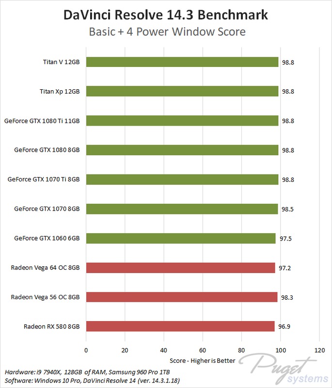 DaVinci Resolve is a bit of a unique applications as it is able to heavily utilize the GPU (or multiple GPUs) to greatly improve performance. We tend to use NVIDIA cards in our workstations as they typcially give better performance in professional applications like Photoshop, After Effects, and Premiere Pro. However, given how much Resolve leverages the GPU we wanted to see how the AMD Radeon Vega video cards compare to the NVIDIA GeForce cards in DaVinci Resolve. It is worth noting that while we will be focusing on DaVinci Resolve performance in this article, choosing a specific GPU to use is a much more complicated topic. Many other factors including current pricing, reliability, power draw, noise level, and available cooler designs are all things that need to be considered.