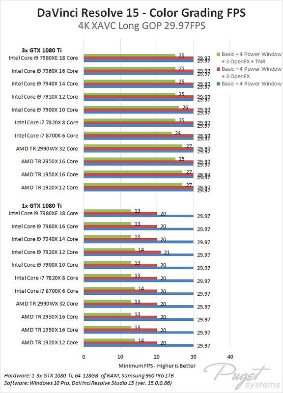 Based on our testing, AMD's Threadripper 2 CPUs are terrific choices for DaVinci Resolve 15. They are not always significantly faster than a similarly priced Intel X-series CPU, but if you have multiple video cards and work with RED footage – especially at 6K/8K resolutions – you can often see significant FPS gains with Threadripper.
