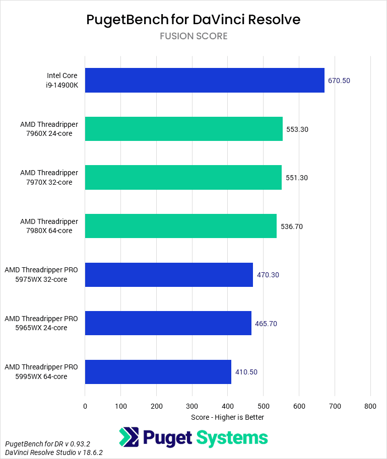 DaVinci Resolve is also unique in that it also includes Fusion (chart #5), which is used for motion graphics and VFX. Unlike the rest of Resolve, Fusion is primarily single-threaded, which typically makes an Intel Core or AMD Ryzen CPU better in terms of raw performance than Threadripper or Xeon.