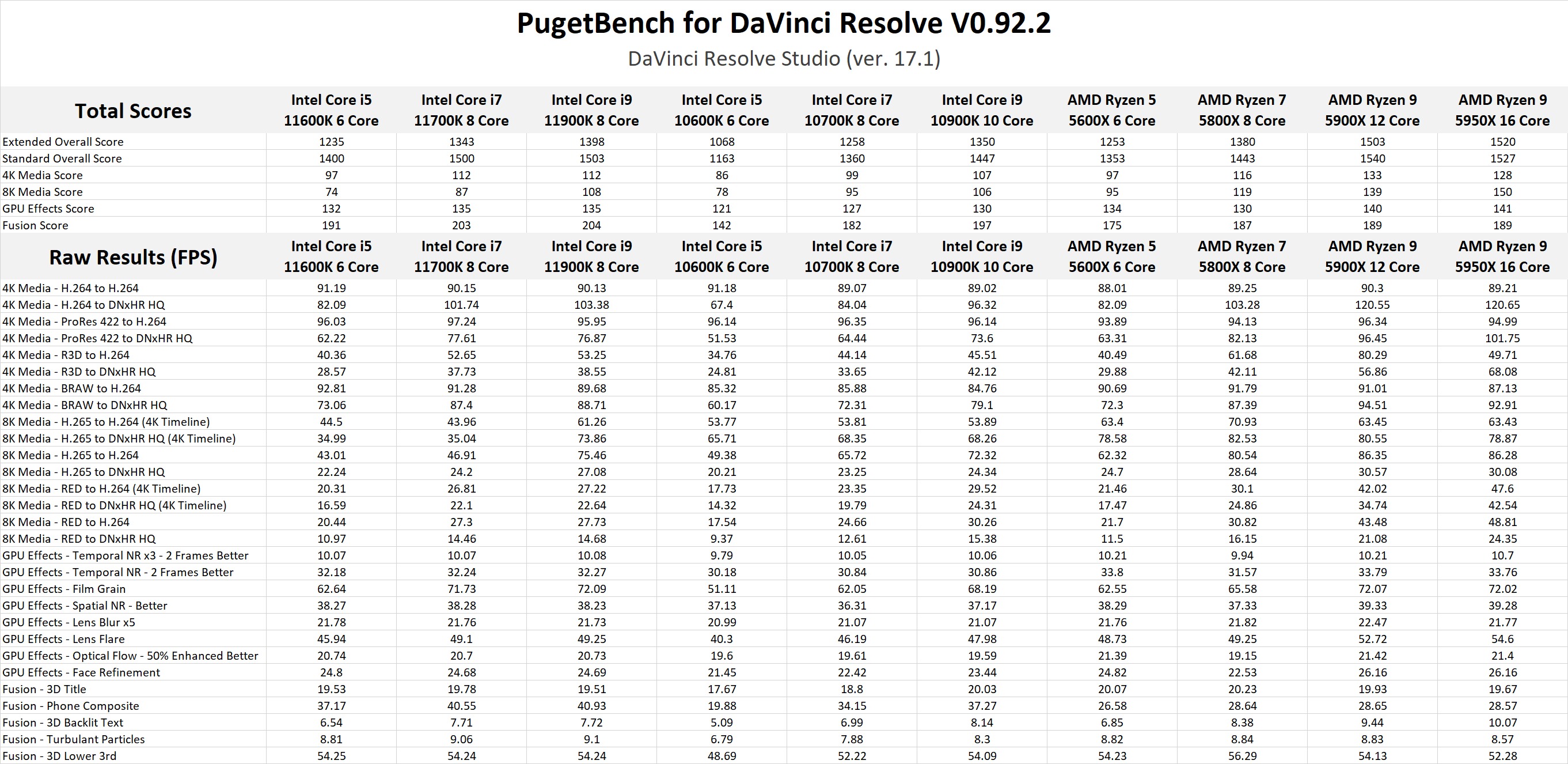 In order to see how the new 11th Gen Intel Core processors perform in DaVinci Resolve Studio, we will be comparing them not only to the previous 10th Gen Intel Core CPUs but also to AMD's Ryzen 5000 series. For the test itself, we will be using our PugetBench for DaVinci Resolve V0.92.2 benchmark and DaVinci Resolve 17.1. This benchmark version includes the ability to upload the results to our online database, so if you want to know how your own system compares, you can download and run the benchmark yourself.