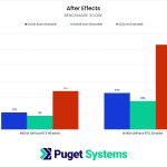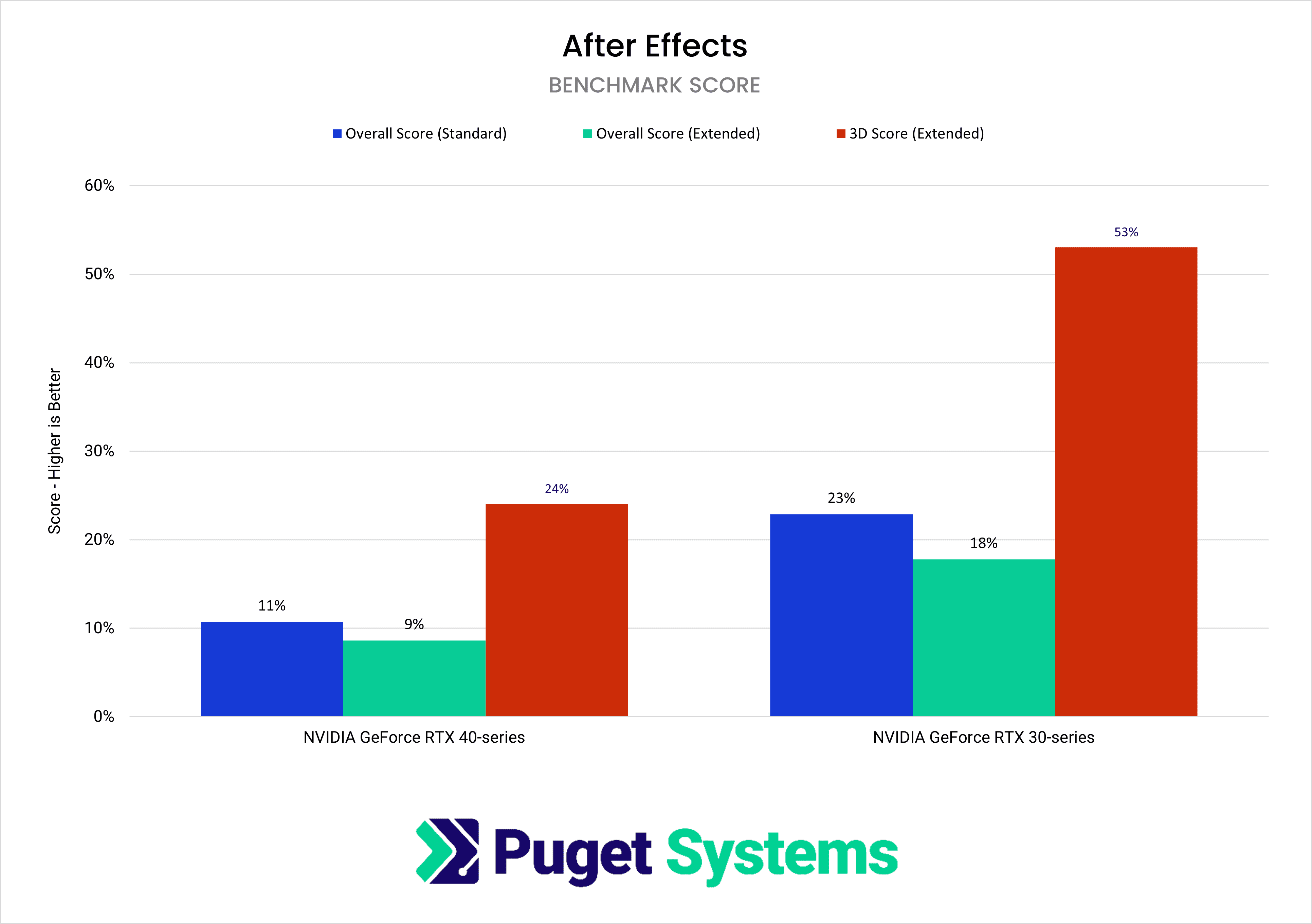 While the GPU does affect rendering performance in After Effects, not all tools and effects leverage it. The tasks processed by the GPU are highlighted in our PugetBench for After Effects benchmark, specifically under the 3D Test score. This helps assess the impact of upgrading to a GeForce RTX 50 Series GPU for motion design tasks in After Effects.