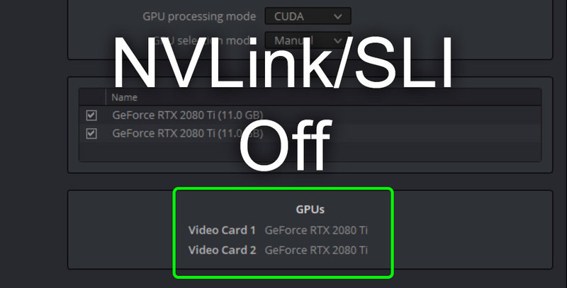 Hopefully this will change in future versions of DaVinci Resolve, but for now, having NVLink enabled is very much a bad thing. It appears that since SLI needs to be enabled for NVLink to work, Resolve is getting confused about what GPUs is can and cannot use. Rather than just ignoring SLI, it actually decides to ignore the second GPU instead. So even if you manually tell Resolve to use both GPUs, it is only able to actually utilize one of them.